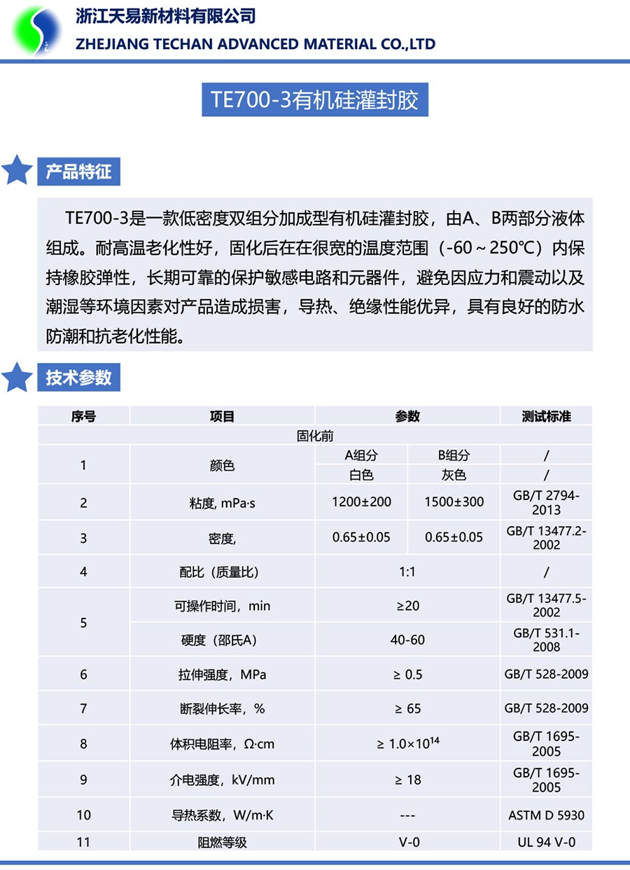 TE700-3是一款低密度雙組分加成型有機硅灌封膠,由A、B兩部分液體組成。耐高溫老化性好,固化后在在很寬的溫度范圍(-60~250℃)內保持橡膠彈性,長期可靠的保護敏感電路和元器件,避免因應力和震動以及潮濕等環境因素對產品造成損害,導熱、絕緣性能優異,具有良好的防水防潮和抗老化性能。
