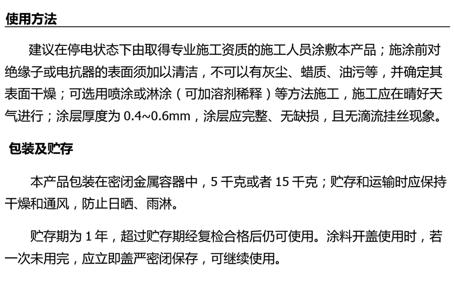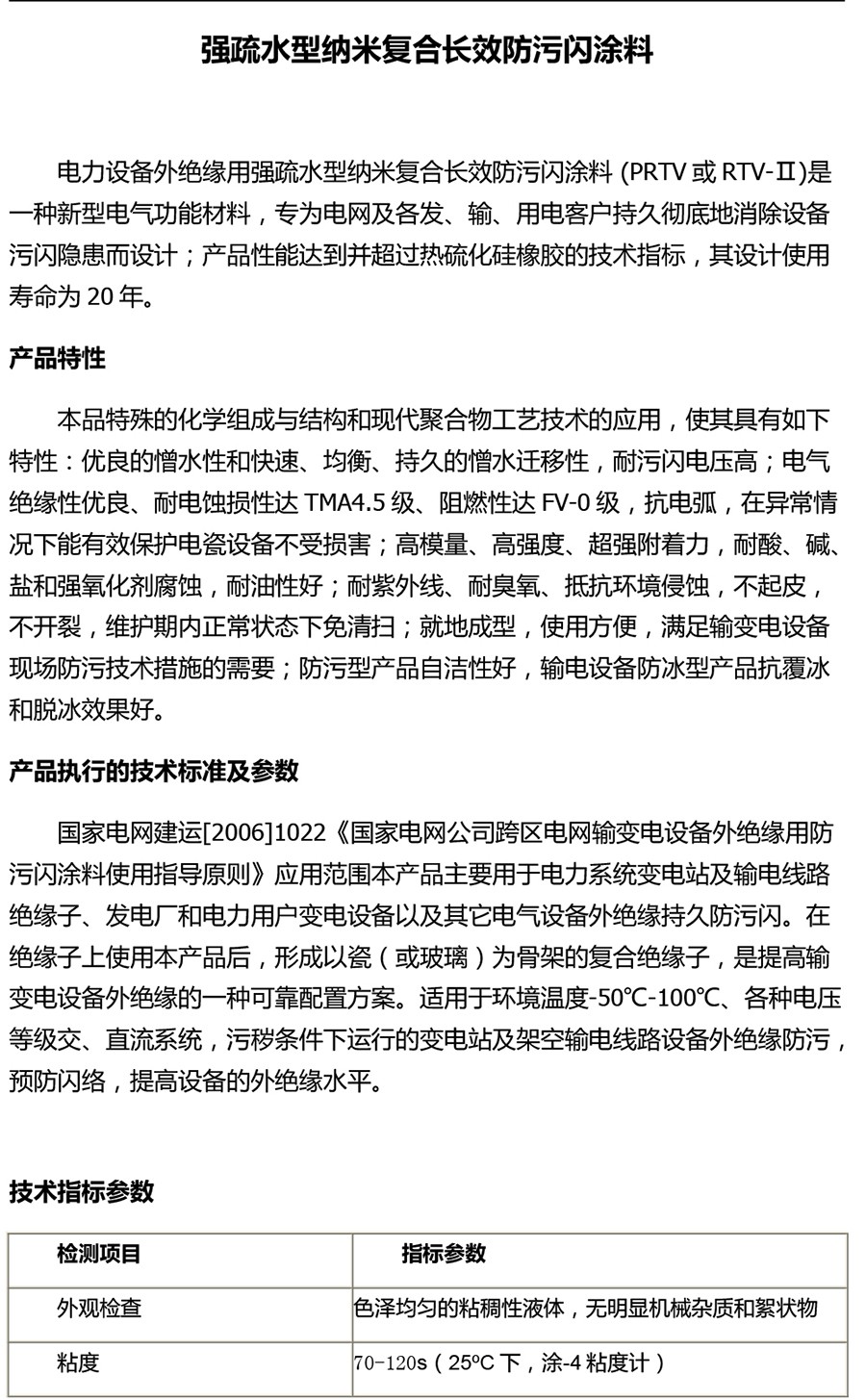 電力設備外絕緣用強疏水型納米復合長效防污閃涂料(PRTV或RTV-Ⅱ)是一種新型電氣功能材料,專為電網及各發、輸、用電客戶持久徹底地消除設備污閃隱患而設計;產品性能達到并超過熱硫化硅橡膠的技術指標,其設計使用壽命為20年。