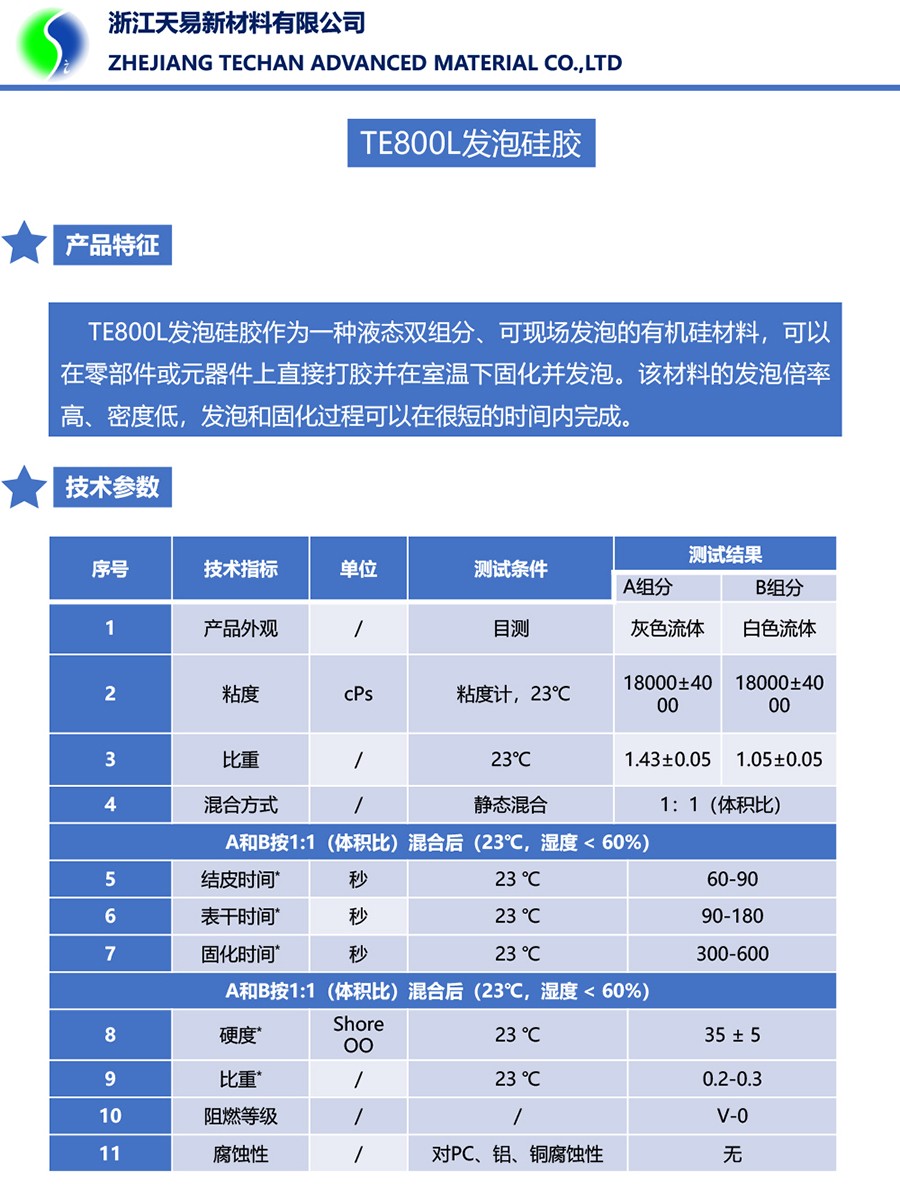 TE800L發(fā)泡硅膠作為一種液態(tài)雙組分、可現場發(fā)泡的有機硅材料,可以在零部件或元器件上直接打膠并在室溫下固化并發(fā)泡。該材料的發(fā)泡倍率高、密度低,發(fā)泡和固化過程可以在很短的時間內完成。