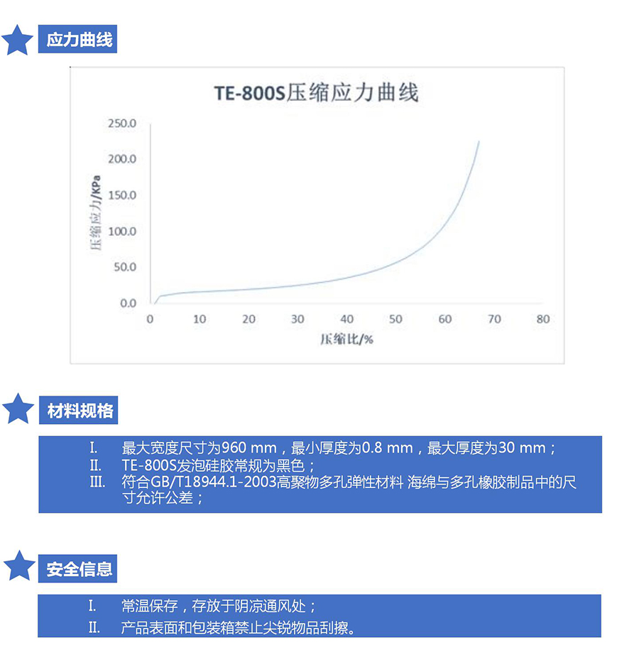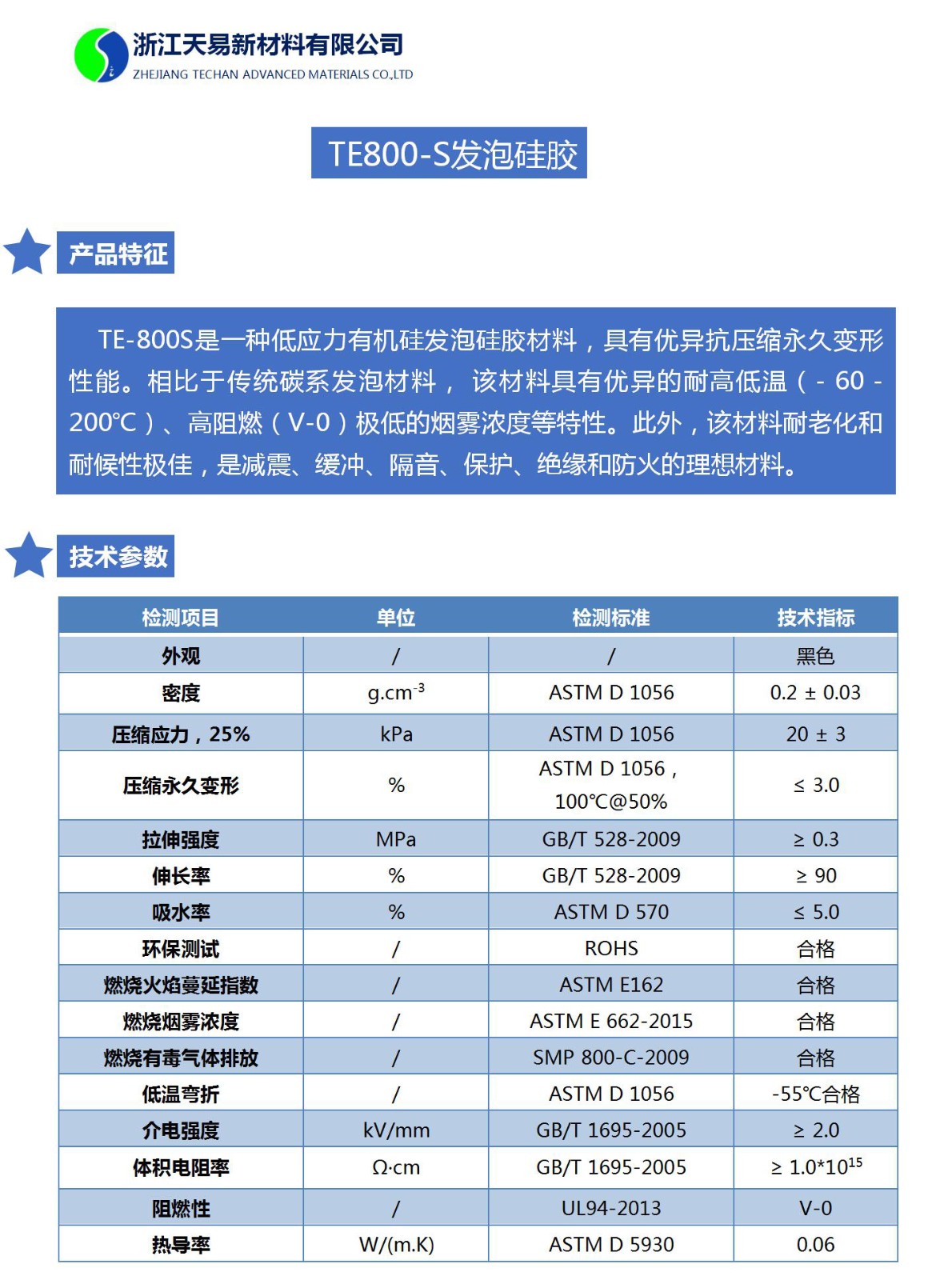TE-800S是一種低應力有機硅發泡硅膠材料,具有優異抗壓縮永久變形性能。相比于傳統碳系發泡材料, 該材料具有優異的耐高低溫(- 60 - 200℃)、高阻燃(V-0)極低的煙霧濃度等特性。此外,該材料耐老化和耐候性極佳,是減震、緩沖、隔音、保護、絕緣和防火的理想材料。